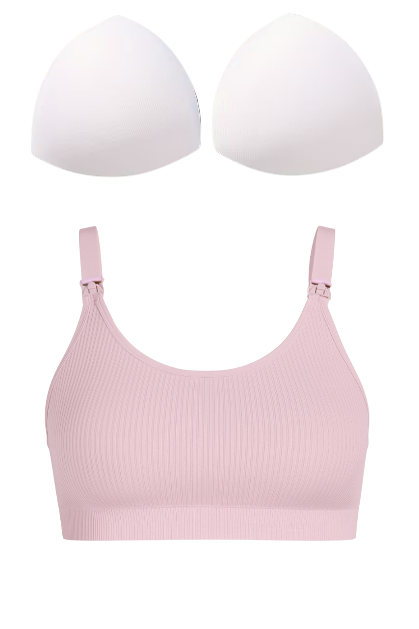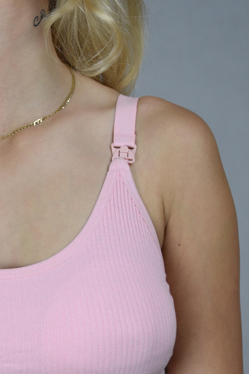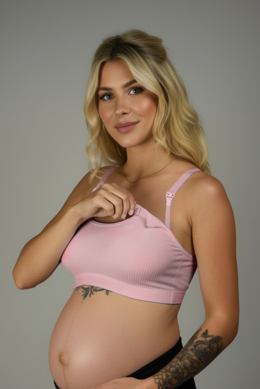 Różowy biustonosz do karmienia bawełniany zachwyca swoją delikatnością i dziewczęcym urokiem. Wykonany z elastycznej, prążkowanej tkaniny z bawełną, idealnie dopasowuje się do ciała, nie krępując ruchów. System odpinanych miseczek umożliwia szybkie karmienie bez konieczności zdejmowania biustonosza – wygodnie i dyskretnie.
