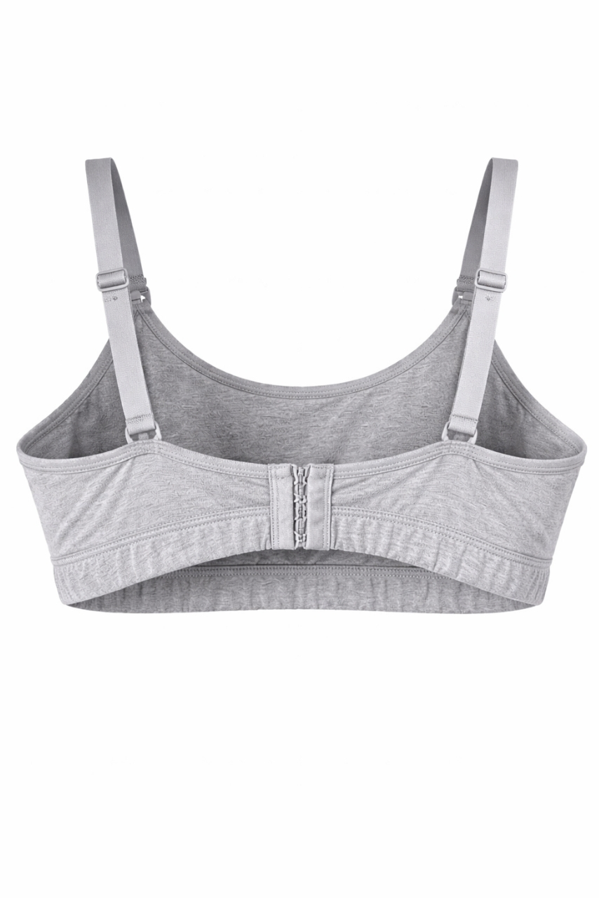 Praktyczne zapięcia przy ramiączkach umożliwiają szybkie odpięcie miseczki jedną ręką, co znacznie ułatwia karmienie w domu i poza nim. Elastyczny pas pod biustem stabilizuje całość, nie powodując dyskomfortu. Ten szary stanik do karmienia bawełniany łączy prostą formę z funkcjonalnością, której potrzebujesz każdego dnia.